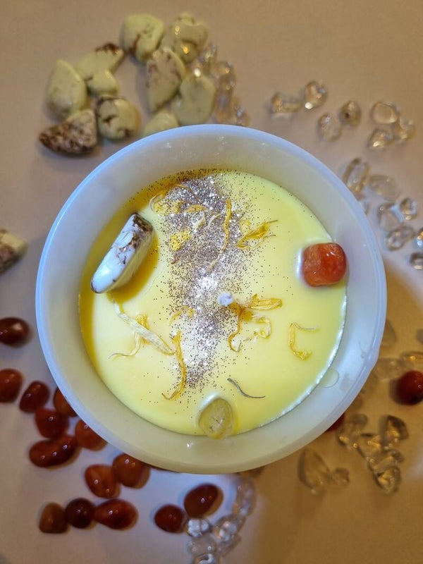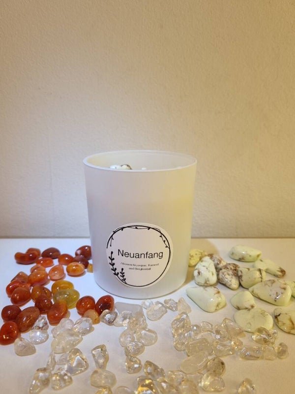 Die handgefertigte Kristallkerze Neuanfang enthält einen Zitronenchrysopas, einen Karneol und Bergkristall in Splitterform.