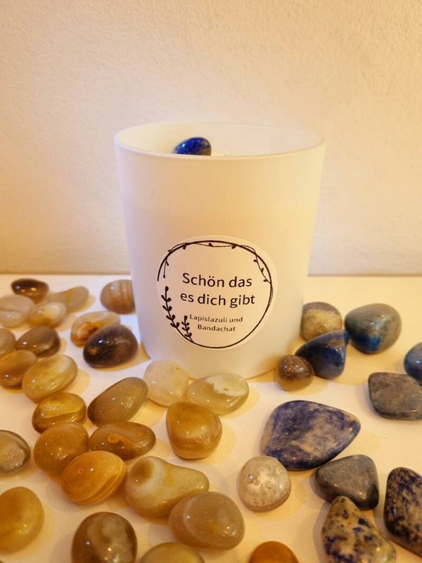 Die handgefertigte Kristallkerze Schön das es dich gibt enthält einen Lapislazuli und einen Bandachat.