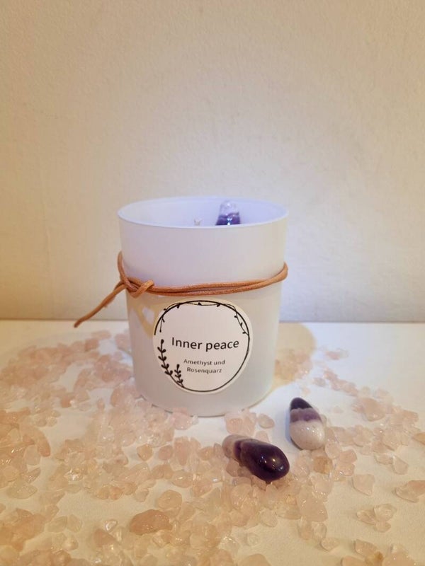 Die handgefertigte Schmuckkerze Inner peace enthält einen Amethyst Chevron als Kettenanhänger und Rosenquarz in Splitterform.