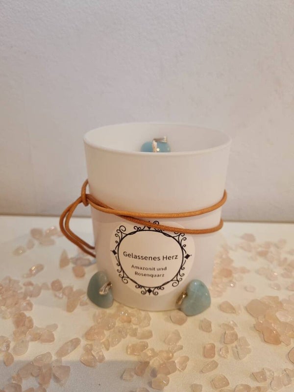 Die handgefertigte Schmuckkerze Gelassenes Herz enthält einen Amazonit als Kettenanhänger in Herzform und Rosenquarz in Splitterform.