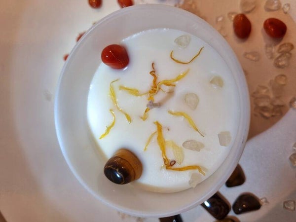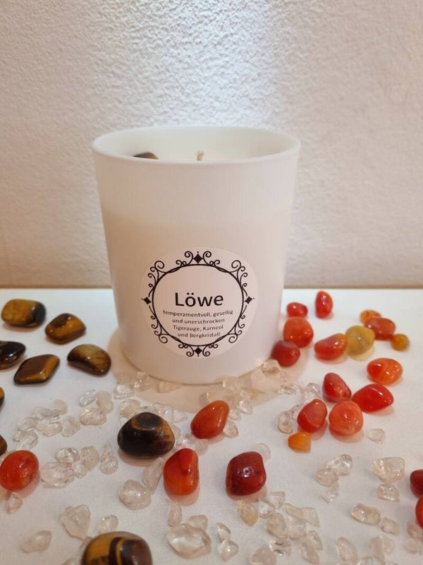 Die handgefertigte Sternzeichenkerze Löwe enthält Tigerauge, Karneol und Bergkristall in Splitterform.